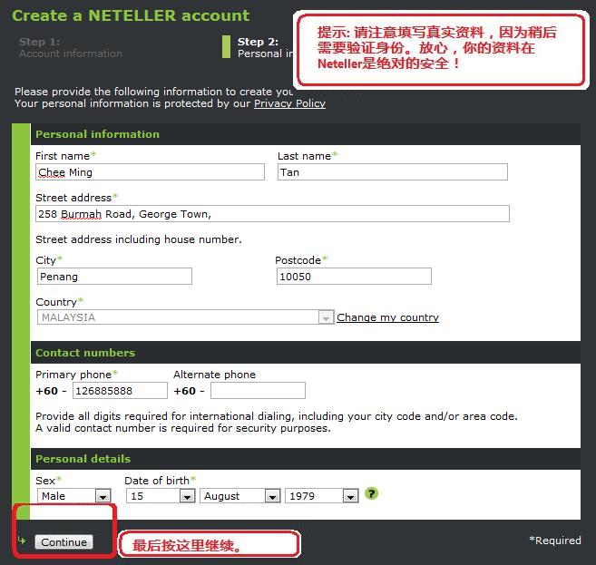 第二步:接下来填写个人资料,资料务必真实,因为NETeller要通过电话确认身份才可以激活帐户。